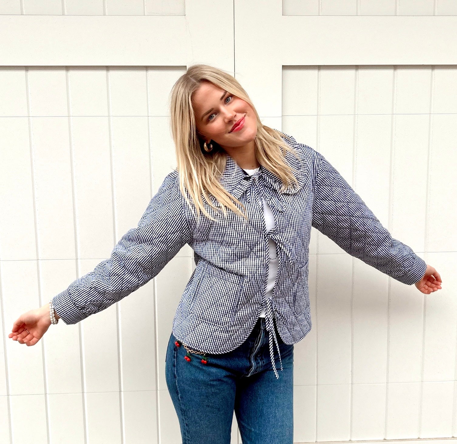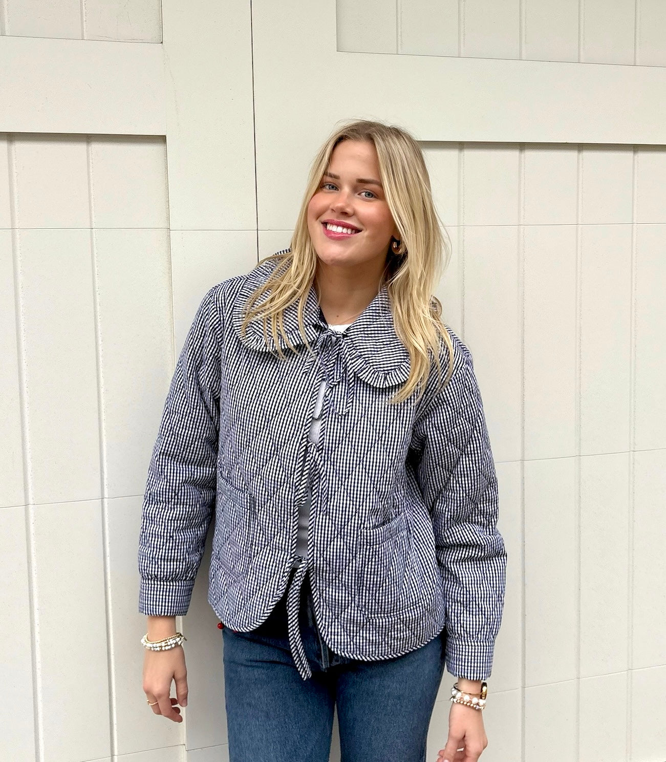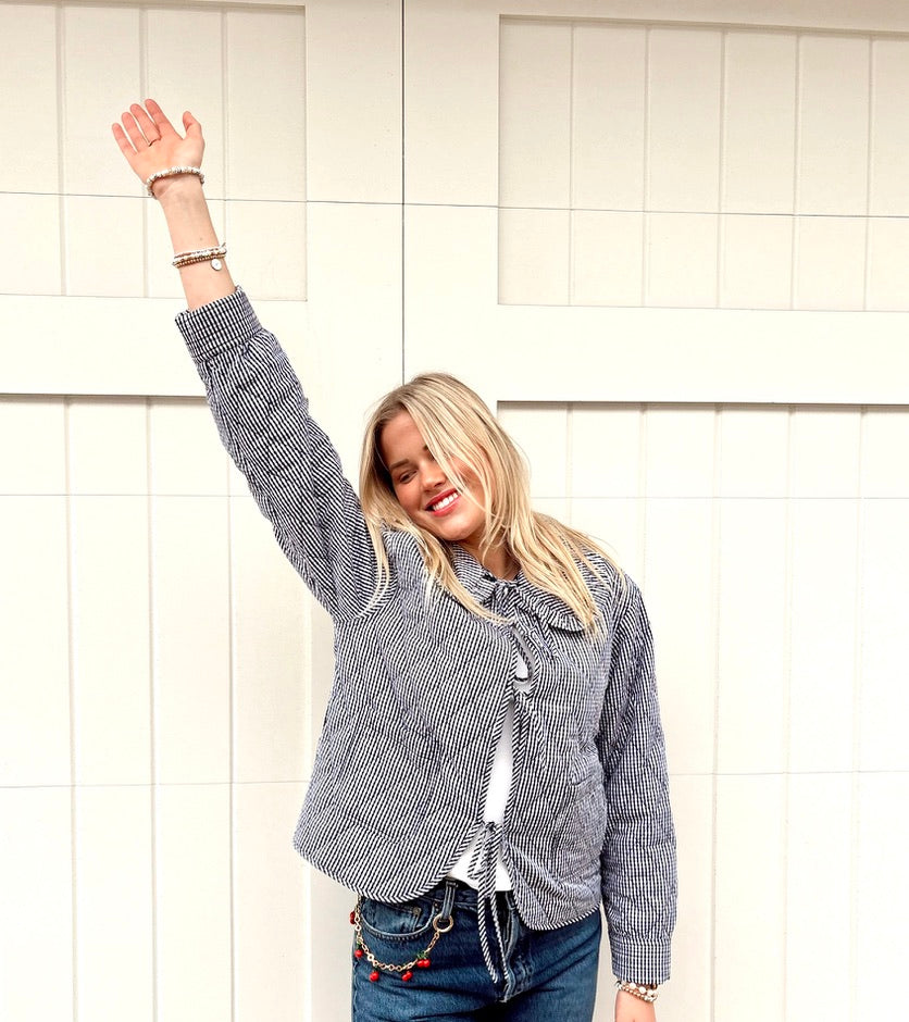Quilted Plaid Jacket with Bow: Navy