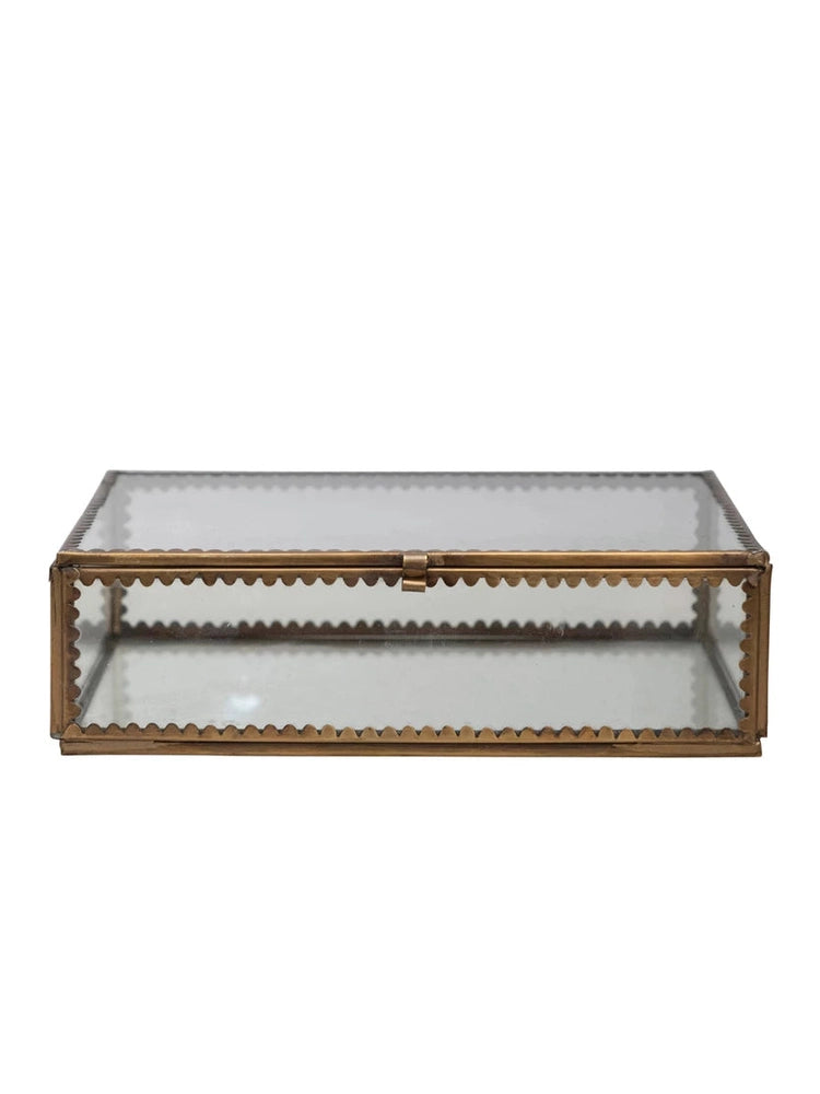 This brass and glass display box with scalloped edges and antique finish is a beautiful piece that will enhance any home décor. This display box has a unique design and an eye-catching vintage charm. The box is made of high-quality brass with an antique finish on the frame and the hinges. The box has clear glass panels on all sides that allow anyone to see the contents inside. The box has scalloped edges that add flair and detail to the piece. This display box is a lovely piece that can store and display small items such as rings, earrings, charms, or crystals. This display box can be placed on a nightstand, dresser, vanity, or shelf to add elegance and beauty to any space. This display box can complement any Victorian, shabby chic, or French country-style home décor with its ornate, romantic, and rustic vibe. This display box is the perfect size for any space, measuring 7 inches in length, 5 inches in width, and 2 inches in height. Order this today and enjoy a stylish and practical addition to any home. Display precious items with this brass and glass display box with scalloped edges and antique finish that features a unique design and a vintage charm. This display box is a wonderful choice for Victorian, shabby chic, or French country style home décor, as it reflects the ornate, romantic, and rustic elements in these themes. This display box is a lovely piece that can be used to store and display small items such as rings, earrings, charms, or crystals. This is made of high-quality brass and glass that reflects the beauty and style of the home décor.
