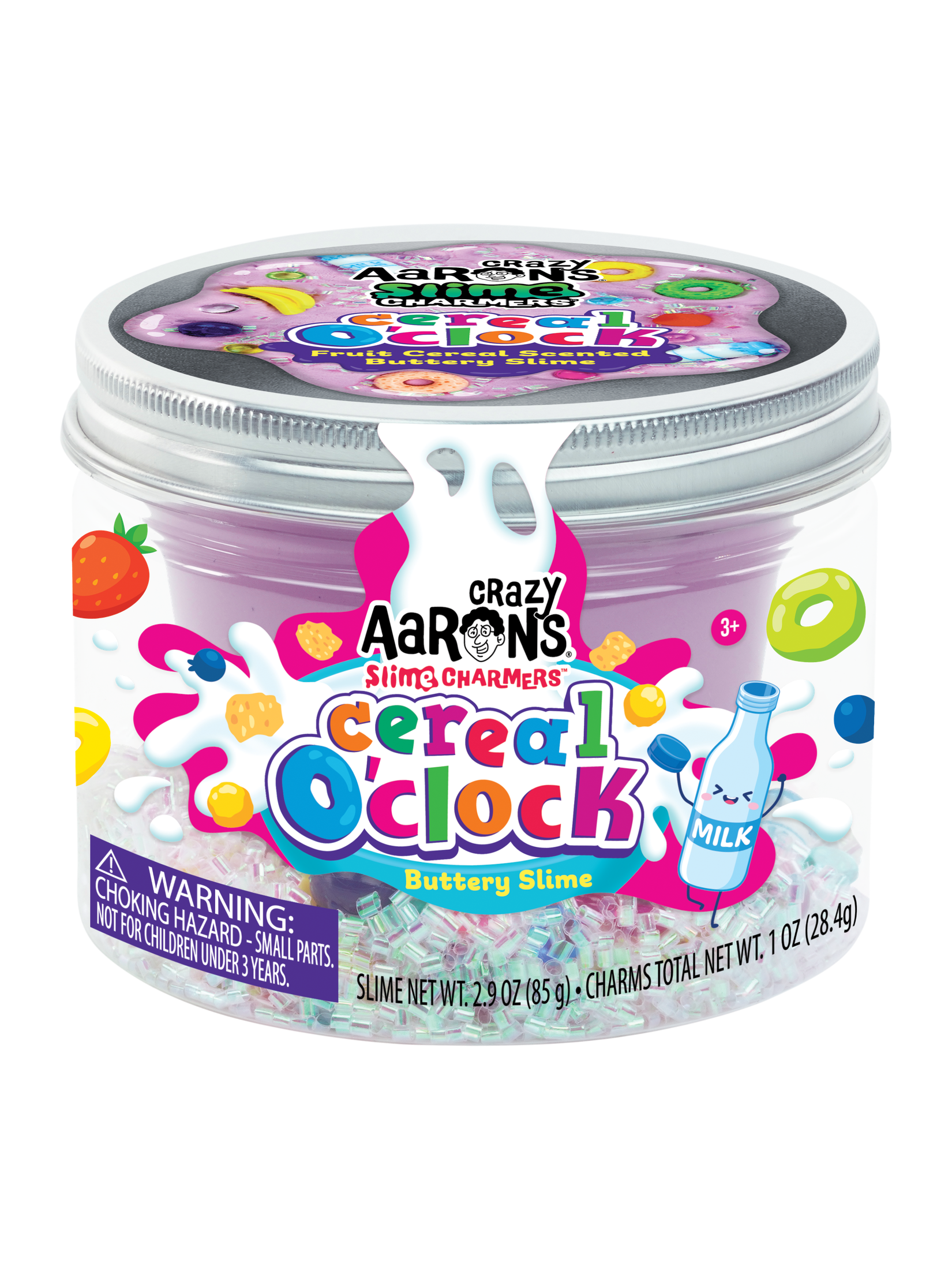 What time is it? It's Cereal O'Clock, of course! Get ready for a bowl full of fun with this smooth, fuit cereal scented, purple butter slime. Crazy Aaron's® Cereal O'Clock Slime Charmers(tm) comes with white bingsu beads for the perfect crunchy texture and cereal-themed charms to mix in. Squish, stretch, and swirl your way to a playful slime adventure that's as fun as your favorite breakfast!
