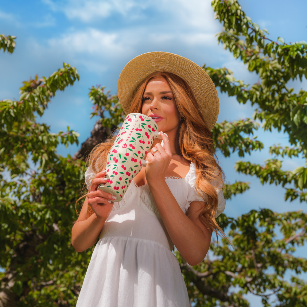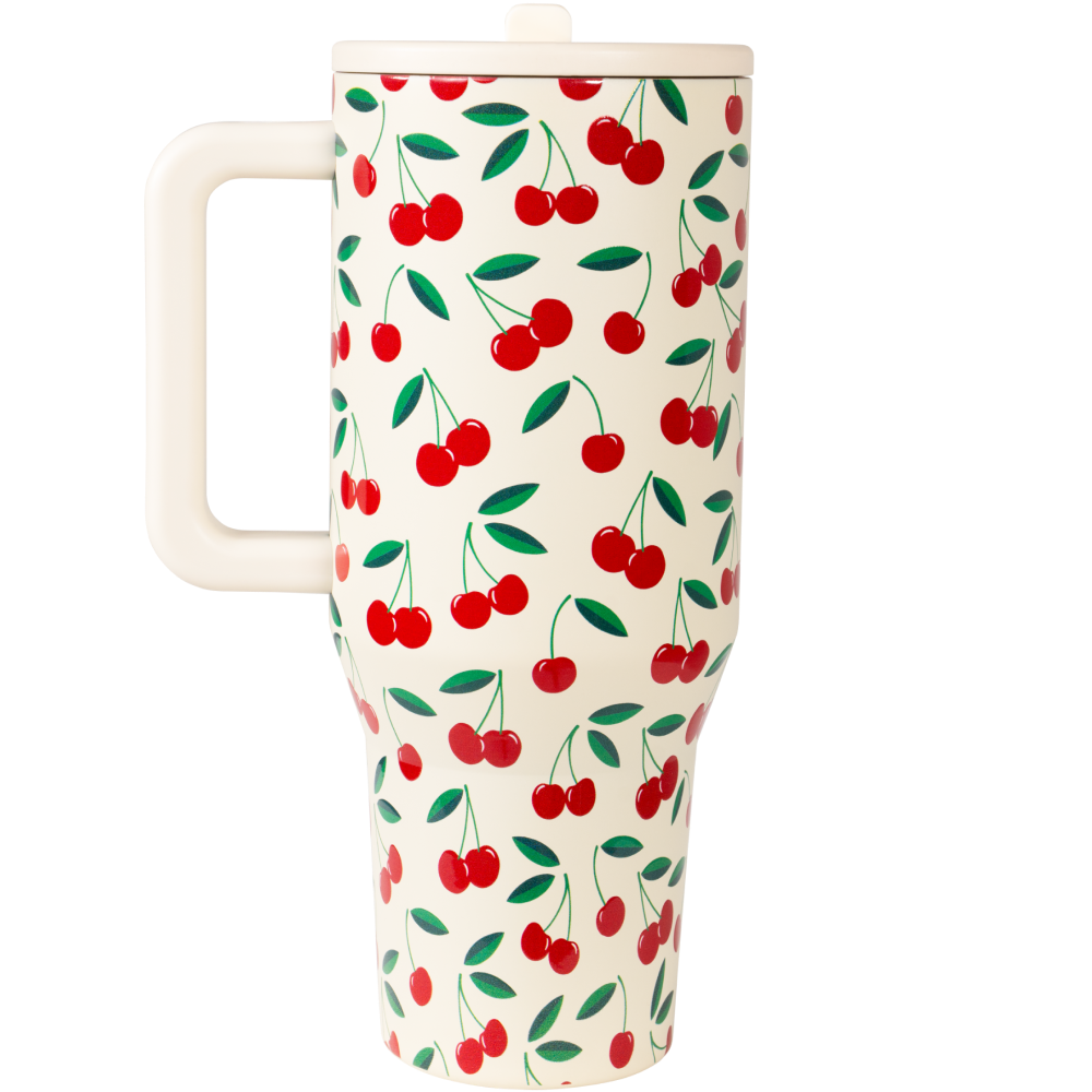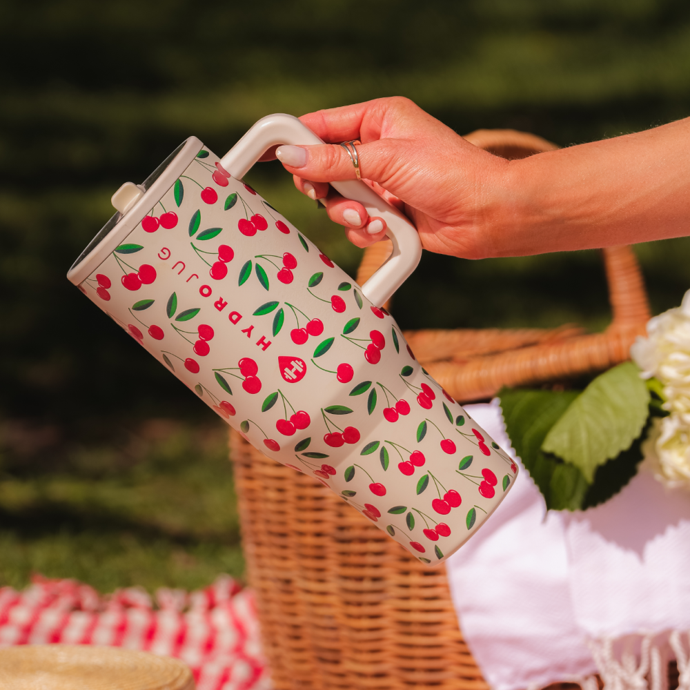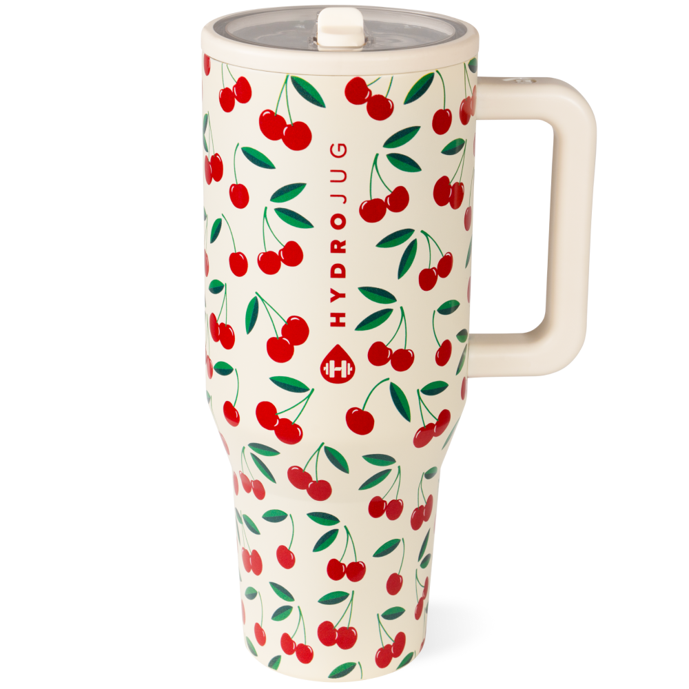 Introducing the HydroJug Cherries 40 oz Traveler Tumbler, a valuable addition to your drinkware collection. This insulated mug/tumbler is designed to keep your beverages at the ideal temperature for hours, whether you're at home or on-the-go. Brought to you by HydroJug, known for its innovative and high-quality products, this tumbler is part of its expanded color variants. Enjoy the quality and style of this traveler tumbler.
