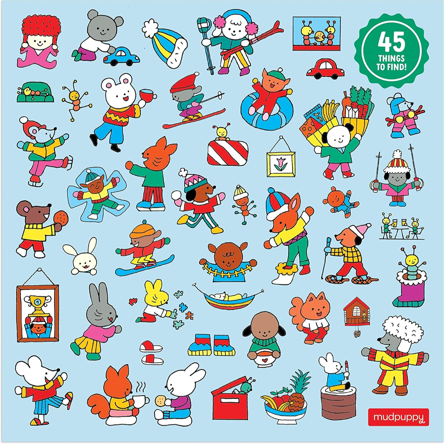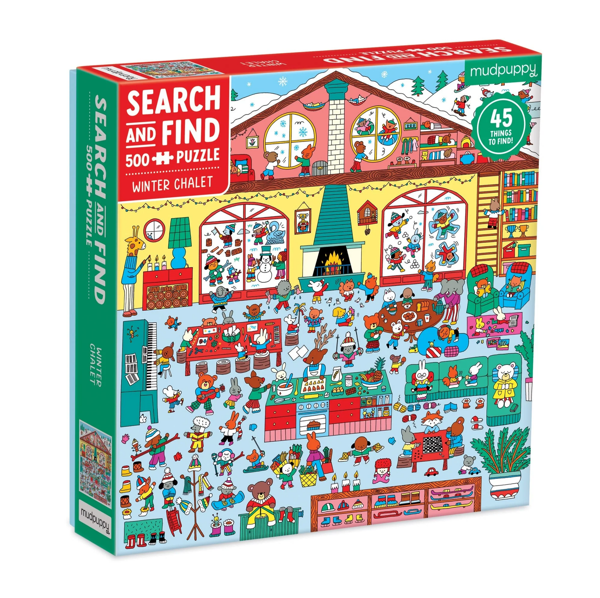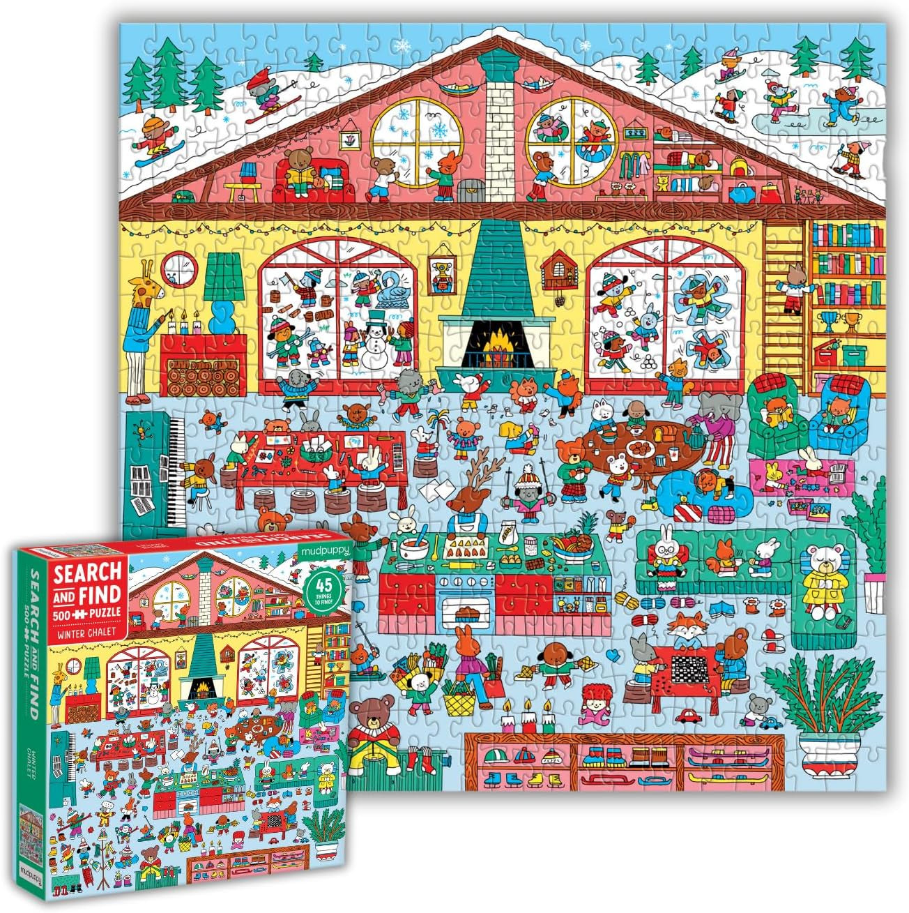 - ☃️500-PIECE PUZZLE: The Winter Chalet 500 Piece Search and Find Family Puzzle from Mudpuppy is the perfect activity for families with children 8 years and older. You will have hours of fun assembling this colorfully illustrated puzzle featuring a fun and festive wintery scene.
