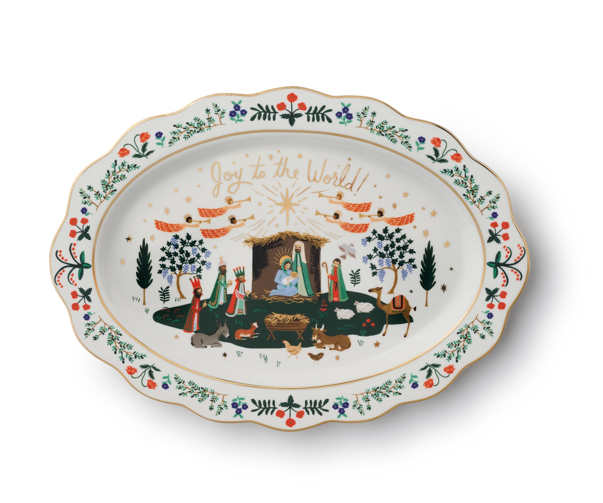 Perfect for holiday gatherings, this porcelain tray features intricate, nativity-inspired illustrations, metallic gold accents, and a gold-painted edge.