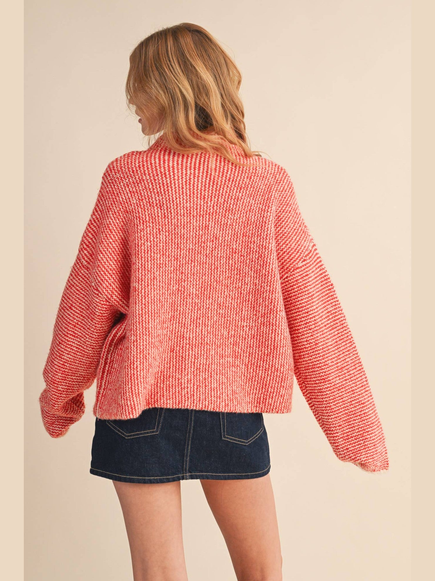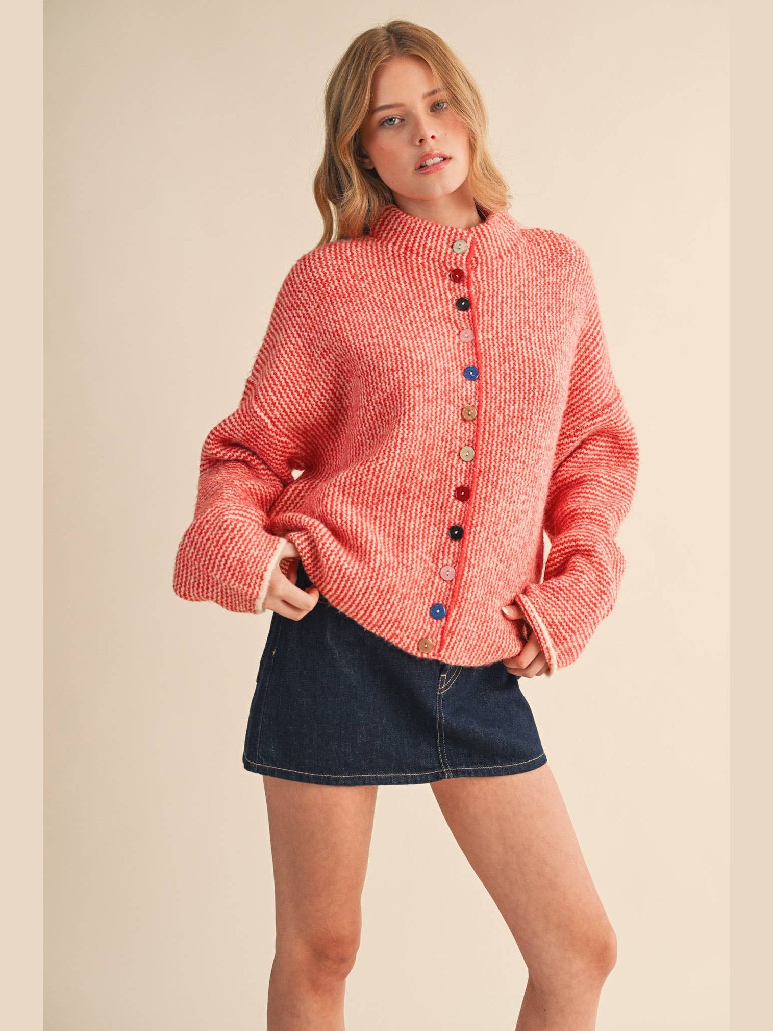 STRIPED SWEATER CARDIGAN WITH COLORFUL BUTTONS: IVORY RED