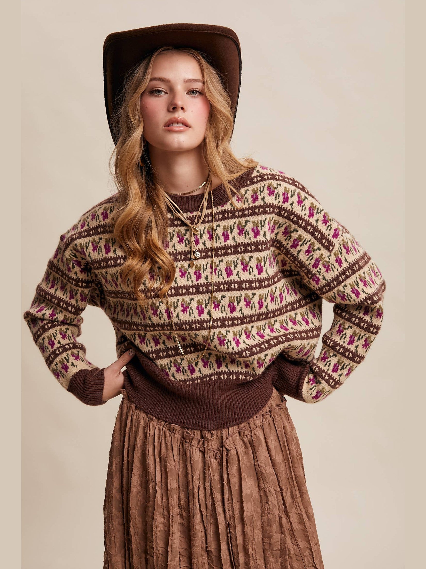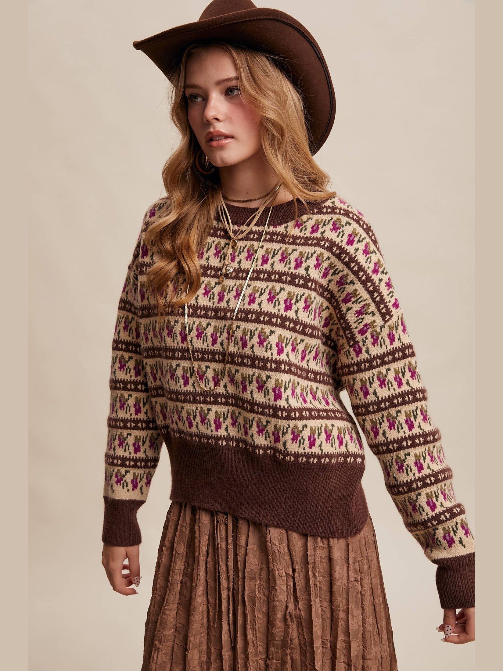 - - Model is 5' 7.5" 33-24-34 and wearing a size Small With its desert-patterned knit and cozy weight, this sweater effortlessly blends Western nostalgia with modern layering-perfect for styling with jeans, cargo pants, or even tucked into a midi skirt for a polished boho look.